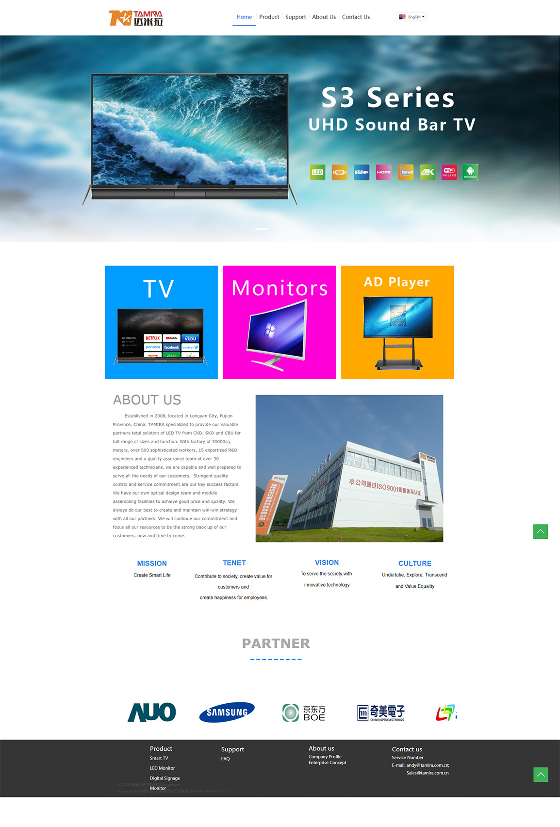 連城縣達(dá)米拉數(shù)碼科技有限公司成立于2008年,位于中國福建省龍巖市。TAMIRA 專門為我們寶貴的合作伙伴提供 CKD、SKD 和 CBU 全系列尺寸和功能的 LED 電視整體解決方案。擁有30000平方米的工廠。米,500多名精良的工人,15名專業(yè)的研發(fā)工程師和30多名經(jīng)驗(yàn)豐富的技術(shù)人員的質(zhì)量保證團(tuán)隊(duì),我們有能力并準(zhǔn)備好滿足客戶的所有需求。嚴(yán)格的質(zhì)量控制和服務(wù)承諾是我們成功的關(guān)鍵因素。我們擁有自己的光學(xué)設(shè)計(jì)團(tuán)隊(duì)和模塊組裝設(shè)施,以實(shí)現(xiàn)良好的價(jià)格和質(zhì)量。我們始終盡最大努力與所有合作伙伴建立和保持雙贏戰(zhàn)略。我們將繼續(xù)我們的承諾,并集中我們所有的資源,成為我們客戶的堅(jiān)強(qiáng)后盾,無論是現(xiàn)在還是未來。