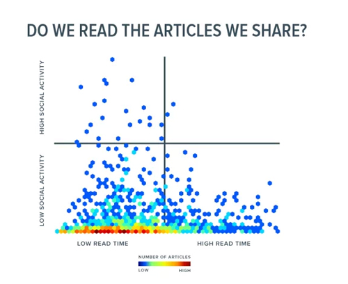 我們檢測(cè)了 10,000 個(gè)可以被社會(huì)化分享的文章,發(fā)現(xiàn)文章被分享的次數(shù),和讀者的關(guān)注程度并無什么關(guān)系。當(dāng)我們把“用戶注意力”和“互聯(lián)網(wǎng)流量”這兩個(gè)指標(biāo)結(jié)合起來看的時(shí)候就會(huì)發(fā)現(xiàn):一篇網(wǎng)民投入的時(shí)間很長的文章,往往并沒有得到 Facebook 上超過 100 的點(diǎn)贊,也不會(huì)得到 Twitter 上超過 50 次的轉(zhuǎn)推。相反的,如果一個(gè)故事被大量地轉(zhuǎn)推或者分享,其實(shí)只有 20% 的人愿意花時(shí)間去看它。