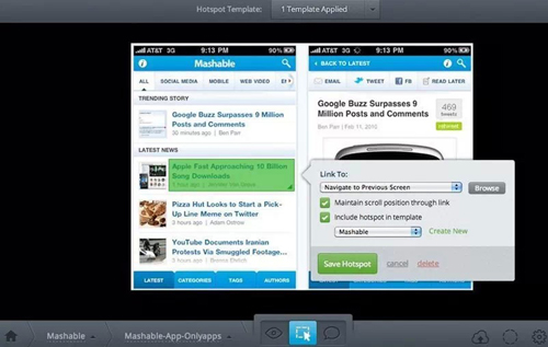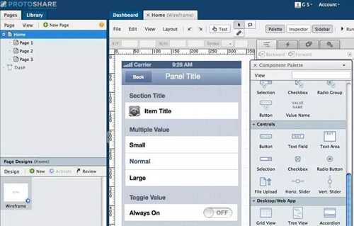 作為一個強大的線框圖和原型平臺,Protoshare提供了大量移動工具集(有來自中心資源庫的大量移動模版和大量2D、3D動畫過渡)。通過“拖放”界 面,你可以快速創(chuàng)建交互式的線框圖和移動原型,然后發(fā)送至iPhone、iPad或者Android設備進行測試,體驗app的功能實現(xiàn)情況。