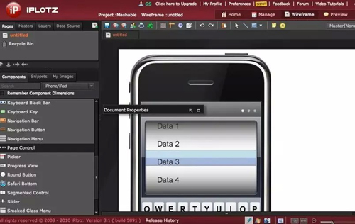iPlotz 是一款可以用來創(chuàng)建可點擊、可導航的原型和線框圖工具,適合網(wǎng)站開發(fā)者和移動app開發(fā)者。你可以在一個可調整的頁面拖放元件,然后連接起來,增加其他屏 幕或者頁面的熱點鏈接。你可以選擇使用iPhone/iPad模版或者Android模版,任何模版都有獨一無二的元件設置。