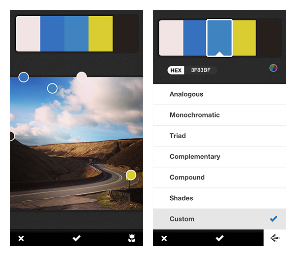 如果你對于從照片中選取自己的配色方案沒有信心,那么使用Kuler app是個好辦法,可以幫助你理解什么造就了照片中的優(yōu)秀配色。隨意拍下大量照片(單調(diào)、樸素色調(diào)和豐富、明亮鮮艷色調(diào)都有),然后用Kuler app認真分析為什么這些配色方案起作用,為什么這個app選擇了它們