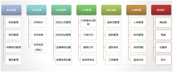 此平臺主要有以下幾大模塊構(gòu)成:商品管理系統(tǒng)、會員管理系統(tǒng)、運費管理系統(tǒng)、權(quán)限管理系統(tǒng)、訂單管理系統(tǒng)、售后管理系統(tǒng)、倉儲管理系統(tǒng)、企業(yè)信息管理系統(tǒng)、優(yōu)惠券、積分管理系統(tǒng)、及其他cms系統(tǒng)。