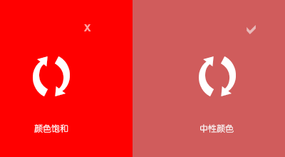 在扁平化設(shè)計中,色彩的應(yīng)用極為重要。由于拋棄了擬物化設(shè)計風(fēng)格的漸變、高光等特效,只能使用純色塊來進行設(shè)計,那么在色彩的搭配和選擇上就極有講究。為了能讓使用者舒適的閱讀、使用設(shè)計者的作品,不造成眼睛疲勞或者其它不適感,設(shè)計師應(yīng)盡量選擇中性的顏色。也就是說,要避免使用飽和度過高的純色,比如純紅、純綠、純藍等顏色,因為這些顏色在展示的時候會非常刺眼,嚴重影響使用者的視覺體驗。同樣可以通過下面的圖片來對比兩者之間的差異:
