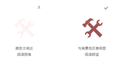 在色彩的應(yīng)用中,要注意顏色之間的對比,只有通過鮮明的顏色對比,才能迅速抓住使用者的眼球,讓設(shè)計師的意圖表現(xiàn)的更加明確。通常的技巧是,通過亮度、色溫、對比色、互補色等等手段來實現(xiàn)顏色的對比,應(yīng)盡量避免使用參數(shù)相近的顏色,這樣的顏色搭配會使閱讀困難,甚至?xí)斐墒褂谜叩臉O度不適。可以通過下面的這張圖來體會其中的奧妙: