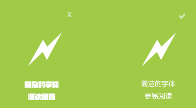 在扁平化設(shè)計風(fēng)格中,因為追求極致的簡潔,力求最快速、最直觀的表達設(shè)計者的意圖,所以在字體的選擇上,也是以簡潔、清爽為標(biāo)準(zhǔn)。應(yīng)采用通用的、筆劃清晰的字體,避免使用字跡不清的字體,比如草書,特殊字體等,也應(yīng)該避免使用已經(jīng)不再流通的字體,比如古代甲骨文、篆體字等等(特殊用途除外)。對于中文字體來說,諸如雅黑、幼圓或者細黑等字體都是不錯的選擇。英文字體也是同樣的道理,如下圖所示: