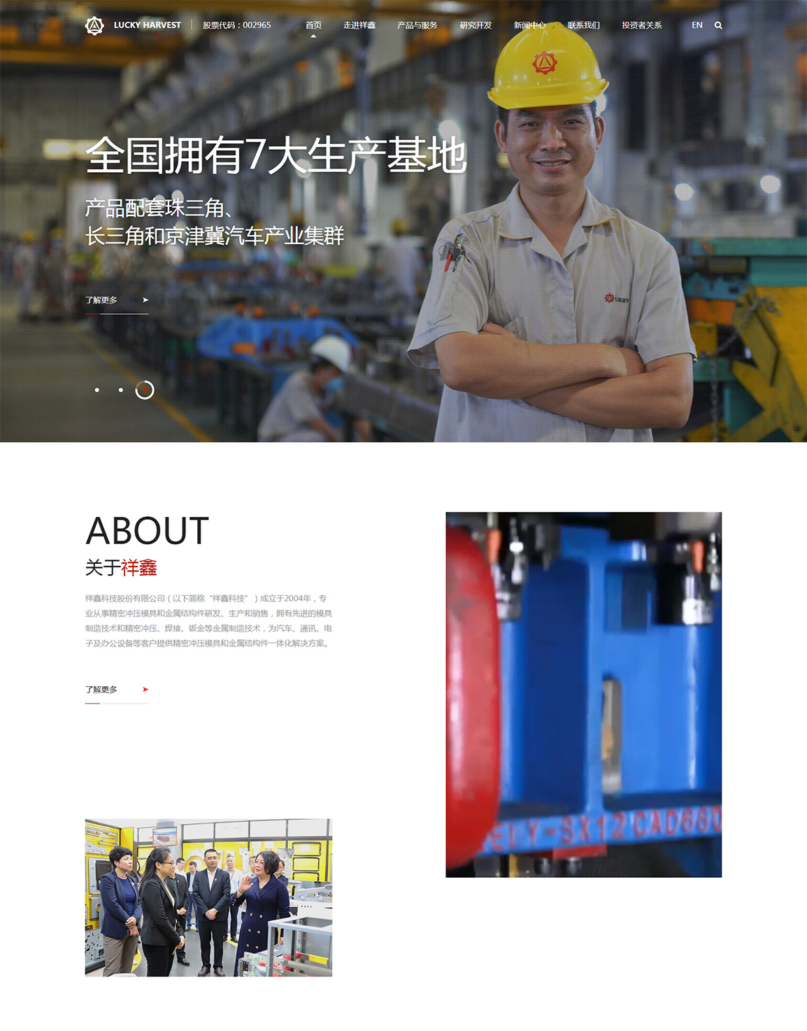 查看網(wǎng)站祥鑫科技股份有限公司(以下簡稱“祥鑫科技”)成立于2004年,專業(yè)從事精密沖壓模具和金屬結(jié)構(gòu)件研發(fā)、生產(chǎn)和銷售,擁有先進(jìn)的模具制造技術(shù)和精密沖壓、焊接、鈑金等金屬制造技術(shù),為汽車、通訊、電子及辦公設(shè)備等客戶提供精密沖壓模具和金屬結(jié)構(gòu)件一體化解決方案。