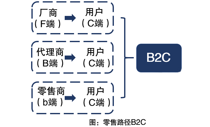 零售路徑是B2C,無論B端是廠家(F2C)、代理商(B2C),還是零售商(b2C),統(tǒng)稱B2C。只要路徑是B2C,本質(zhì)上就是零售。