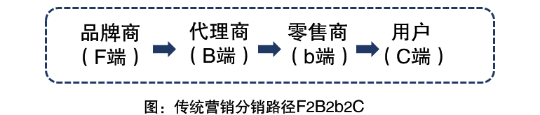 傳統(tǒng)營銷的分銷路徑是B2B2C,準(zhǔn)確地說是F2B2b2C。管理路徑是分段的,分為品牌商的F2B,代理商的B2b,零售商的b2C。