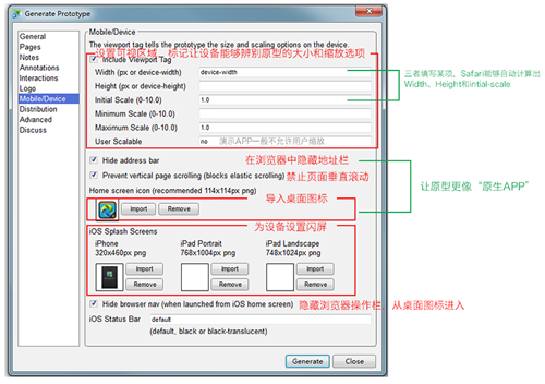 大家都很熟悉了,這里主要說下移動端的演示,這樣才充分表達原型意圖。按F5生成原型的時候,在“Mobile/Device”選項中可以設置適配移動設備 的特殊原型(Axure 6.5以下版本),再用移動設備訪問你生成的原型鏈接即可(該頁面創(chuàng)建一個桌面快捷方式)。