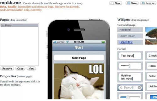 Mokk.me 是一個簡單快速的原型工具,通過界面上簡單的拖放操作,不用了解單線編程就能創(chuàng)作一個可以分享、測試以及多平臺的app。目前,Mokk.me正在測試 中,但它是一個簡單的基本的工具,任何人可以用它來創(chuàng)建app的布局。你可拖、放或者編輯小工具,可以搭建和連接頁面,還可以選擇過渡動畫。它的特點還在 于頁面和按鈕、圖片小工具、文本輸入以及復選框形式。