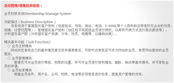 此平臺(tái)主要有以下幾大模塊構(gòu)成:會(huì)員管理系統(tǒng)、權(quán)限管理系統(tǒng)、企業(yè)信息管理系統(tǒng)、信息收集系統(tǒng)及其他cms系統(tǒng)。