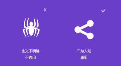 在設(shè)計圖標(biāo)時,必須使用與所對應(yīng)功能緊密關(guān)聯(lián)的圖標(biāo)元素,并且這個元素應(yīng)是通用的、廣為人知的,基本不受地域、種族、文化、語言等因素影響。絕對禁止使用一些定義模糊,寓意不清的元素,或者某些行業(yè)特有的,某些領(lǐng)域?qū)S玫脑?。比如在下面這張圖中,如果設(shè)計師要表達的是“分享”這一功能,那么顯然右側(cè)的圖標(biāo)更具有通用性: